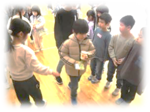 1月28日(水)、来年度入学予定の年長さんを迎えて「体験入学」を行いました。はじめに、現1年生が先輩として、学校での学習の様子を元気よく発表しました。国語・算数・生活・音楽・体育の各教科に分かれ、どの発表も堂々とした姿が印象的でした。発表の後には歌を披露し、退場の際には手作りの「けんだま」をプレゼントしました。